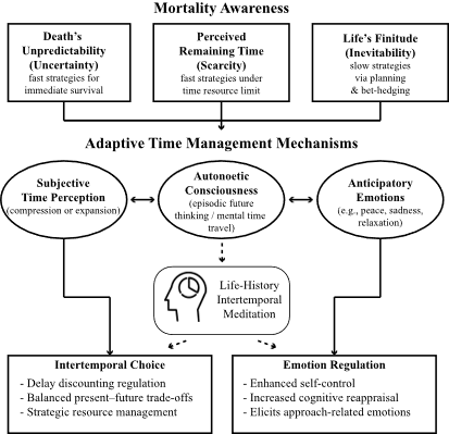 Adaptive time management is a newly developed life-history framework that integrates humans’ capacity for mental time travel with mortality awareness as a strategic process for time and resource allocation. Rather than triggering terror management, we conceptualize mortality awareness as an adaptive cue that recalibrates subjective time perception and episodic future thinking. This framework maps three key life-history factors (resource scarcity, unpredictability, and harshness) onto corresponding decision premises: perceived remaining time, death’s uncertainty, and life’s inevitability. We review evidence suggesting that: (1) constricted horizons accelerate delay discounting and favor immediate, fast strategies; (2) unpredictability of death (temporal variation of death) evokes emotions and prompt strategic present-oriented choices that secure survival under high-risk conditions; (3) inevitability of death (life’s finitude) fosters slow strategies through resource bet-hedging mental travel that allows time measure and management; and (4) episodic end-of-life thinking elicits anticipatory emotions that adaptively regulate self-control and cognitive reappraisal. We also introduce preliminary findings on “life-history intertemporal meditation” as a potential intervention for adaptive regulation. Finally, we discuss adaptive time management in applications in death education and mental health. Together, this framework highlights how harnessing life-history mental time travel and mortality awareness can promote adaptive decision-making and emotional resilience across the lifespan.