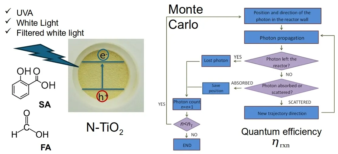Nitrogen-modified titanium dioxide (N-TiO2) is proposed as an alternative to improve solar light absorption in photocatalytic applications. Due to its high chemical stability and low toxicity, various synthesis methods have been developed, yielding materials with different properties. Evaluating its performance compared to other photocatalysts requires calculating the quantum efficiency, which involves appropriate mathematical models to interpret experimental data. This study used a Monte Carlo approach to determine the local volumetric rate of photon absorption (LVRPA). TiO2 and N-TiO2 were synthesized via the sol-gel method using urea as the nitrogen source, and commercial TiO2 P-25 was used as a reference. Formic acid and salicylic acid were chosen as model pollutants due to their differing adsorption behavior on TiO2. Three light sources were used: UVA, white, and blue light. Nitrogen doping increased quantum efficiency for formic acid degradation under UVA from 2.4 to 3.5 (46% increase) and salicylic acid from 1.0 to 2.1 (110% increase). P-25 showed the highest efficiencies under UVA, with 6.2 for formic acid and 5.2 for salicylic acid. Under white light, salicylic acid degradation efficiency doubled from 0.4 to 0.8 after nitrogen doping. No activity was observed for formic acid with undoped TiO2 under white light, but N-TiO2 achieved 1.1. Under blue light, no activity was detected for formic acid, while salicylic acid degradation showed efficiencies of 0.3 (N-TiO2) and 0.2 (P-25). Quantum efficiency was highest under UVA, indicating that nitrogen doping improves visible light response but does not surpass UVA performance.