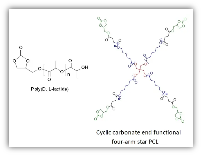 Well-defined α-(cyclic carbonate), ω-hydroxyl heterotelechelic poly (D,L-lactide)s (PDLLAs) were prepared with good end-group fidelity by ring-opening polymerization (ROP) of D,L-lactide catalyzed by organo catalyst namely, N,N′ dimethyl amino pyridine (DMAP) in conjunction with a renewable, functional bio-based initiator namely glycerol 1,2-carbonate (GC) in bulk at 135 °C with 82% yield. In the case of GC/DMAP catalyzed polymerizations, the HO-PDLLA-COOH series was not observed in MALDI TOF mass analysis unlike as obtained due to transesterification reactions when catalyzed by GC/Sn(Oct)2. Also, cyclic carbonate end-functional 4-arm star poly(ε-caprolactone) (PCL) was prepared via coupling of GC with (PCL-COOH)4 at room temperature in the presence of N,N′-dicyclohexylcarbodiimide (DCC) and DMAP. Quantitative conversion of hydroxyl functionality in (PCL-OH)4 to carboxylic acid and then to cyclic carbonate functionality was achieved with 90% yield for low molecular weight 4-arm star PCL confirmed by NMR, FT-IR, and MALDI TOF mass spectroscopy.