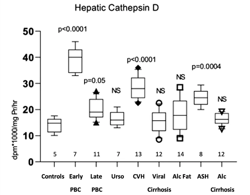 Lysosomal enzymes are implicated in autophagy and senescence. Hepatic lysosomal enzymes have not been studied in Primary Biliary Cholangitis (PBC). We therefore quantified the activities of lysosomal hydrolases in liver tissue of PBC patients. We compared enzyme activities in liver tissue from PBC patients with normal livers. Alcoholic liver disease and chronic viral disease served as disease controls. Cathepsin B1 was significantly increased in early PBC (225.1 ± 18.06 mean ± SD, p < 0.0001) and reduced in later stages (66.5 ± 9.7, p = 0.004, controls 130.4 ± 14.9). It was reduced in patients with extensive fibrosis such as alcoholic and viral cirrhosis (p < 0.01 and p = 0.004 respectively) but not in chronic hepatitis. Cathepsin D was increased in early PBC (39 × 103 ± 4.8 SD, p < 0.0001) and less so in later stages (20.1 × 103 ± 3.9, p = 0.05, controls 14.1 × 103 ± 2.9). It was also increased in the presence of histological necro-inflammation in hepatitis. Treatment with ursodeoxycholate (UDCA) restored the abnormal values of enzymes in PBC. Lipid hydrolases mostly paralleled the changes of Cathepsins. Sequential measurements in serum of patients with acute alcoholic hepatitis showed that cathepsin B1 gradually decreases, and esterases increase as aminotransferases improve. The increased activity of lysosomal enzymes in early PBC are possibly on line with increased senescence. Treatment with UDCA restores abnormal values. In chronic liver disease, Cathepsin B1 reduction is associated with fibrosis and increased cathepsin D with necro-inflammation. Abnormalities of lysosomal enzymes indicate impairment of the final stage of autophagy in chronic liver disease.