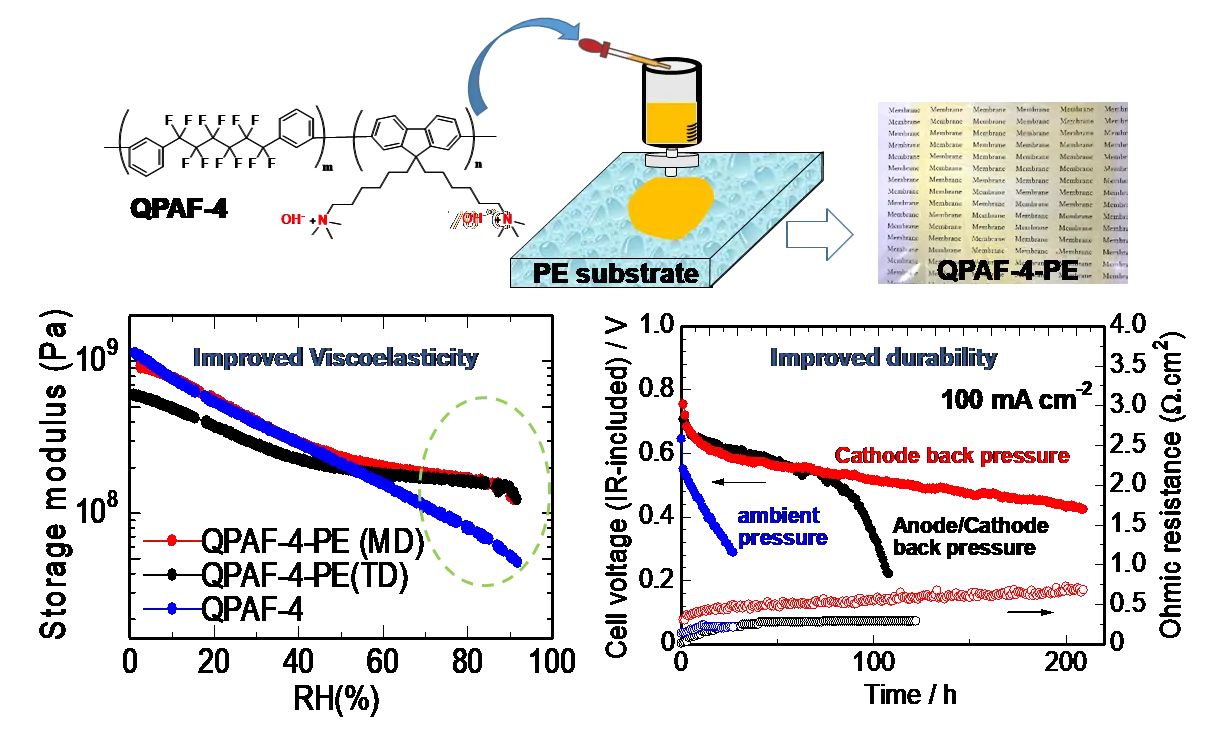 To enhance mechanical robustness of our in-house anion exchange membrane (QPAF-4), the reinforcement technique was applied using ozone-treated, porous polyethylene (PE) thin film (Toray SETELA) as a substrate. Homogenous and flexible reinforced membranes (QPAF-4-PE, 15–20 µm thick) were obtained by bar-coating method. The cross-sectional SEM image and EDS analysis revealed triple-layered (sandwich-like) structure without detectable pinholes. The QPAF-4-PE with ion exchange capacity (IEC) of 1.48 meq·g−1 exhibited lower water uptake (15 wt% at 90% relative humidity) and slightly lower hydroxide ion conductivity (71 mS·cm−1 at 80 ℃) than those of the pristine QPAF-4 (IEC = 1.84 meq·g−1, 25 wt% water uptake and 82 mS·cm−1 of the conductivity). The reinforced QPAF-4-PE exhibited slightly higher viscoelasticity (particularly, in MD direction) due to the suppressed water absorbability. Furthermore, the elongation at break increased by 9.8% in TD direction and 6.3% in MD direction. An H2/O2 fuel cell using QPAF-4-PE as membrane was investigated at different back-pressure, in which the cell with 100 kPa back-pressure onto the cathode side only achieved the maximum performance (176 mW·cm−2 at current density of 364 mA·cm−2) and the longest durability for (>200 h) at a constant current density of 100 mA·cm−2 maintaining 0.43 V of the cell voltage (67% remaining). The durability was eight times longer than that with ambient pressure and two times longer than that with back-pressure on both sides.