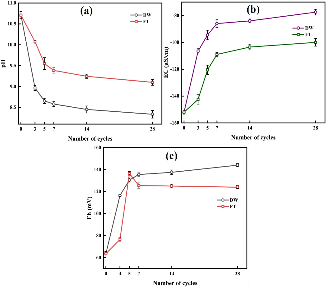 This study investigates the long-term mobility and ecological risks of As, Zn, and Cd in calcium arsenic residue (CAR) under simulated dry-wet (DW) and freeze-thaw (FT) cycles. Accelerated aging experiments, combined with multiscale characterization (XRD, XPS, SEM, FTIR), revealed distinct transformation mechanisms. DW cycles promoted carbonate-driven dissolution, As(III) oxidation to As(V) (resulting in an 18.4% increase in As(V) as shown by XPS), and sulfide oxidation (with reductions of 47.7% in ZnS and 15.08% in CdS). These processes increased the acid-soluble metal fractions (F1: As by 11.3%, Zn by 6.0%, and Cd by 8.7%) and metal release rates (52.39% for As, 42.63% for Zn, and 68.55% for Cd under DW conditions). In contrast, FT cycles induced mechanical fracturing and ice-mediated stabilization, which limited ion migration, partially amorphized ZnO, and promoted the precipitation of Cd(OH)2. Ecological risk assessments indicated rising risks, with integrated potential ecological risk indices (IPER) reaching 11,187.85 under DW conditions and 10,668.29 under FT conditions, with arsenic contributing over 80%. The Risk Assessment Code (RAC) reclassified all metals into moderate-risk categories (As: 11.9–19.7%, Zn: 9.4–15.2%, Cd: 12.1–18.6%). Weibull modeling (α = 6.98–10.98, R2 > 0.96) described the nonlinear kinetics, showing that cadmium aged the fastest (λ: Cd > As > Zn), with delayed but persistent risks under FT conditions. These results underscore the importance of developing climate-resilient stabilization strategies. The integrated framework combining mineral evolution, kinetics, and risk forecasting offers significant insights for managing legacy CAR pollution under changing climate conditions.