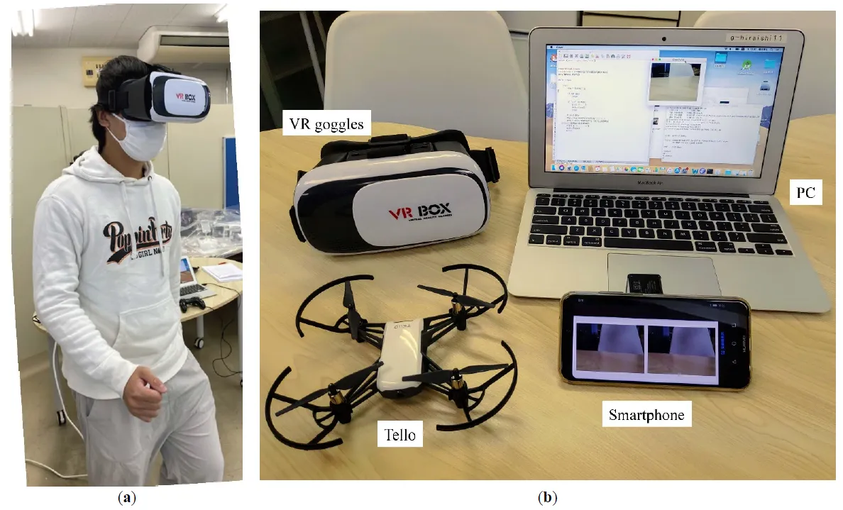 This study proposes a method for operating drones using natural human movements. The operator simply wears virtual reality (VR) goggles. An image from the drone camera was displayed on the goggles. When the operator changes the direction of his or her face, the drone changes the direction to match that of the operator. When the operator moves their head up or down, the drone rises or falls accordingly. When the operator walks in place, rather than walking, the drone moves forward. This allows the operator to control the drone as if they were walking in the air. Each of these movements was detected by the values of the acceleration and magnetic field sensors of the smartphone mounted on the VR goggles. A machine learning method was adopted to distinguish between walking and non-walking movements. Compared with operation via conventional remote control, it was observed that the remote controller performed better than the proposed approach in the early stages. However, when the participants familiarized themselves with the natural operation, these differences became relatively small. This study combined drones, VR, and machine learning. VR provides drone pilots with a sense of realism and immersion, whereas machine learning enables the use of natural movements.