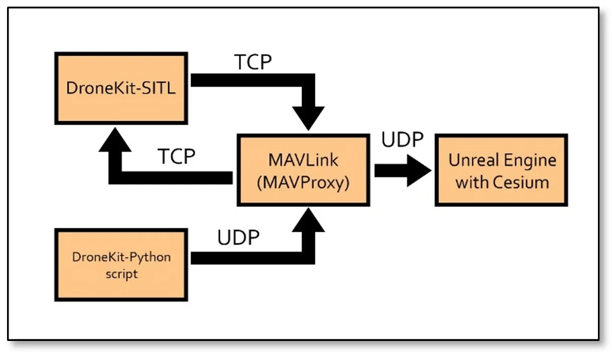 Drone simulation refers to the emulation of Unmanned Aerial Vehicles (UAVs) in a virtual environment, replicating real-world conditions to study and test the behavior, performance, and functionalities of drones. This paper explores the simulation of UAVs in the Unreal Engine environment using MAVProxy (Micro Air Vehicle Proxy) and the Python library DroneKit. By leveraging the computational capabilities of computers, this approach enables precise visualization and control of UAV flight dynamics in three dimensions. The use of Blueprints in Unreal Engine facilitates a cost-effective and accessible simulation process, allowing engineers and scientists to refine their UAV designs before real-world deployment. Results show the applicability of this approach vs. different environments, where an alternative approach also emerges as a viable option for visualizing textured buildings. This approach shows the power of open-source collaboration in advancing innovative solutions in the dynamic field of science and technology.