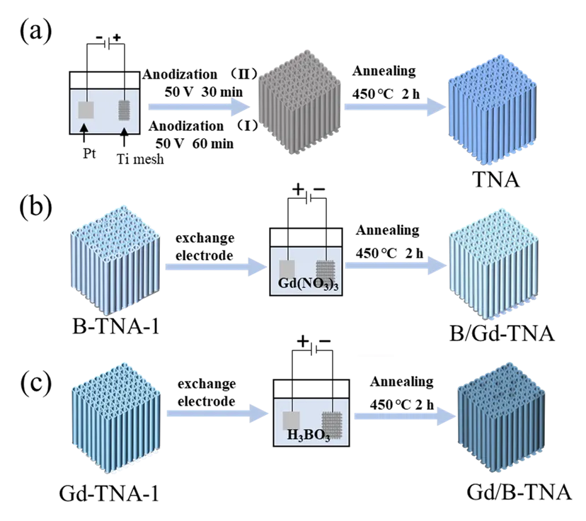 Although photocatalytic degradation of VOCs has attracted widespread attention, the efficient visible-light-driven photocatalytic degradation performance remains a challenge. This work presents the visible-light-driven photocatalytic degradation of gaseous toluene over B, Gd co-doped TiO2 nanotube arrays prepared via a controllable electrochemistry method. It was found that B and Gd co-doping strategy not only enhances the visible light responsiveness of TiO2 nanotube arrays but also introduces moderate oxygen vacancies on the surface of TiO2, which is beneficial to the formation of free hydroxyl radicals and their attack on toluene molecules. The doping order also affects the photocatalytic performance. The optimized sample achieves an enhanced degradation efficiency for toluene under visible light irradiation and exhibits considerable stability. This work may provide an efficient TiO2-based photocatalyst for the removal of volatile organic compounds for air purification and give an understanding of the mechanism of photocatalytic degradation of toluene over co-doping TiO2.