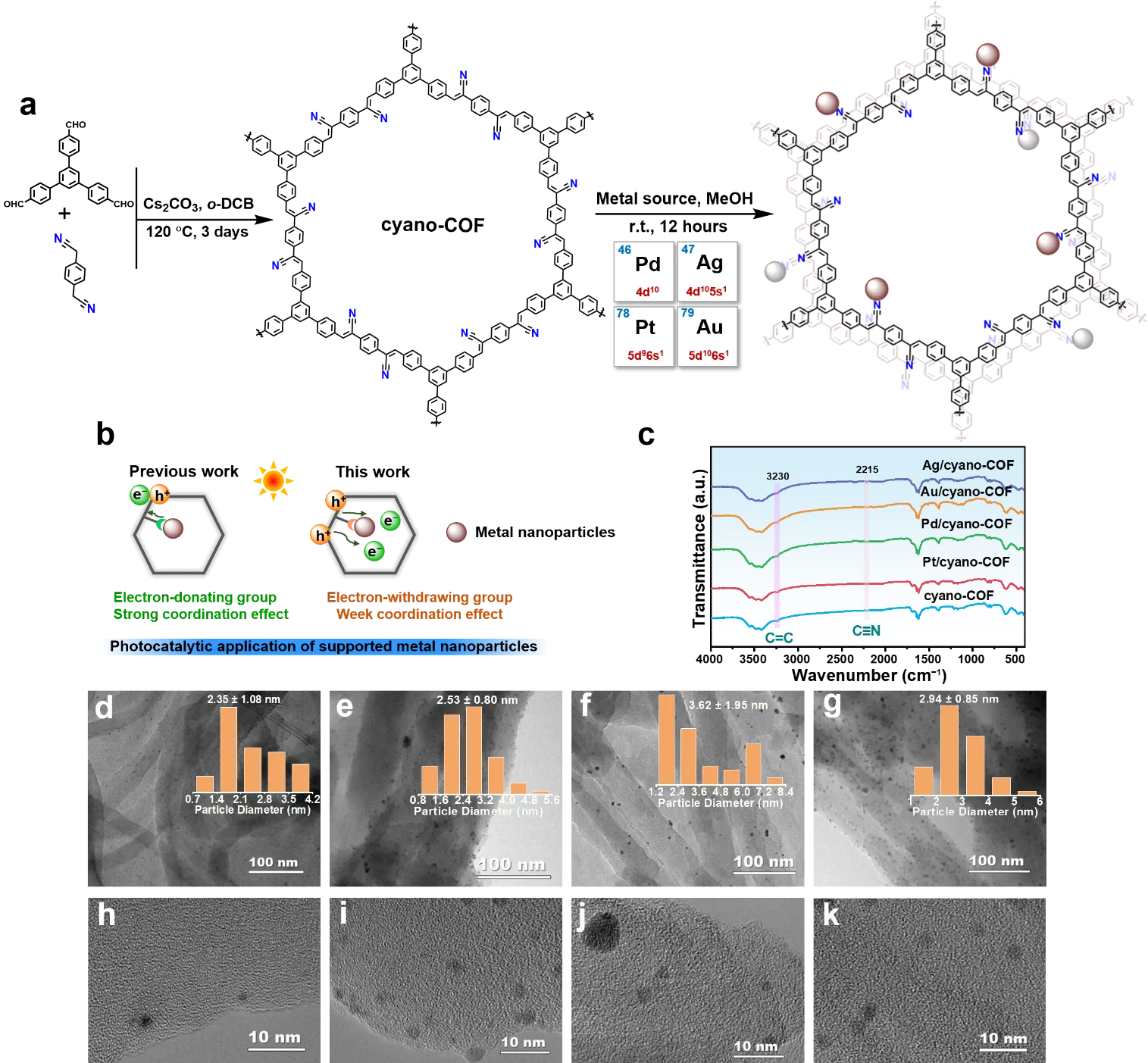Photocatalytic O2 reduction to hydrogen peroxide (H2O2) is a promising chemical synthesis pathway with green property. However, the development of efficient and stable photocatalysts that enable high selectivity and activity remains an urgent scientific challenge. Herein, cyano-based covalent organic framework (cyano-COF) photocatalysts modulated by noble metal sites (i.e., Pt, Pd, Au, and Ag), denoted as Pt/cyano-COF, Pd/cyano-COF, Au/cyano-COF, and Ag/cyano-COF, are designed and synthesized. The cyano-group (-C≡N), acting as a strong electron acceptor, interacts with the noble metal sites to establish an efficient electron transfer pathway, which facilitates the separation of photogenerated charges, optimizes the reaction pathway, and thus enables boosted generation of H2O2 via the two-step single electron oxygen reduction reaction (O2→·O2−→H2O2). Under visible irradiation, Pt/cyano-COF, Pd/cyano-COF, Au/cyano-COF, and Ag/cyano-COF deliver superior H2O2 production rates of 903 ± 24, 1073 ± 35, 963 ± 9, and 851 ± 56 μmol·g−1·h−1, respectively, much higher than that of pristine cyano-COF (577 ± 69 μmol·h−1·g−1). This study offers profound insights into the mechanism of noble metal sites in the solar-driven selective reduction of O2 to H2O2 synthesis.