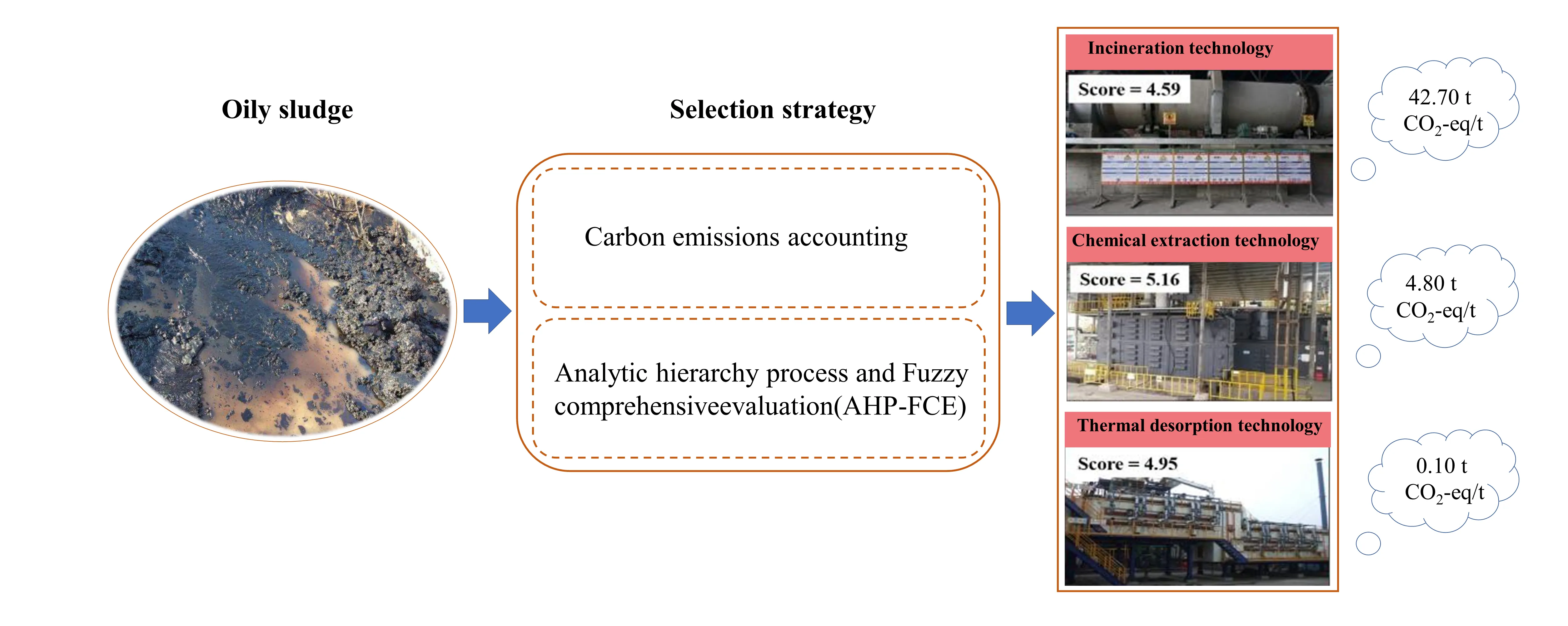 Oil is an unsustainable energy since it is non-renewable. However, oil may not be completely replaced in a short time, so the environmental problems caused by the oil development still require our attention. The oily sludge is a kind of hazardous waste produced during the oil development. To reduce the environmental impact caused by oily sludge, low-carbon and sustainable treatment technologies need to be selected. The incineration, chemical extraction and thermal desorption are common technologies for treatment of oily sludge. We calculated the carbon emissions of these technologies. Then the index evaluation system of oily sludge treatment technology was established with the environmental, economic, social, and technical factors. And the weight of evaluation index was determined by the analytic hierarchy process (AHP). Through the investigation of industry experts, we evaluated the treatment technologies by the fuzzy comprehensive evaluation method (FCE). The results showed that the carbon emissions of incineration are 42.70 t CO2-eq/t which is the highest. Meanwhile, it is 4.80 t CO2-eq/t and 0.10 t CO2-eq/t for chemical extraction and thermal desorption, respectively. The comprehensive scores of incineration, chemical extraction and thermal desorption were 4.59, 5.16 and 4.95, respectively. Therefore, the chemical extraction technology is an optimal treatment technology for oily sludge with the relatively low carbon emission and the highest comprehensive technical score. At the same time, the thermal desorption technology has strong application potential with the lowest carbon emissions. This result provides a reference for achieving clean and sustainable energy development processes.