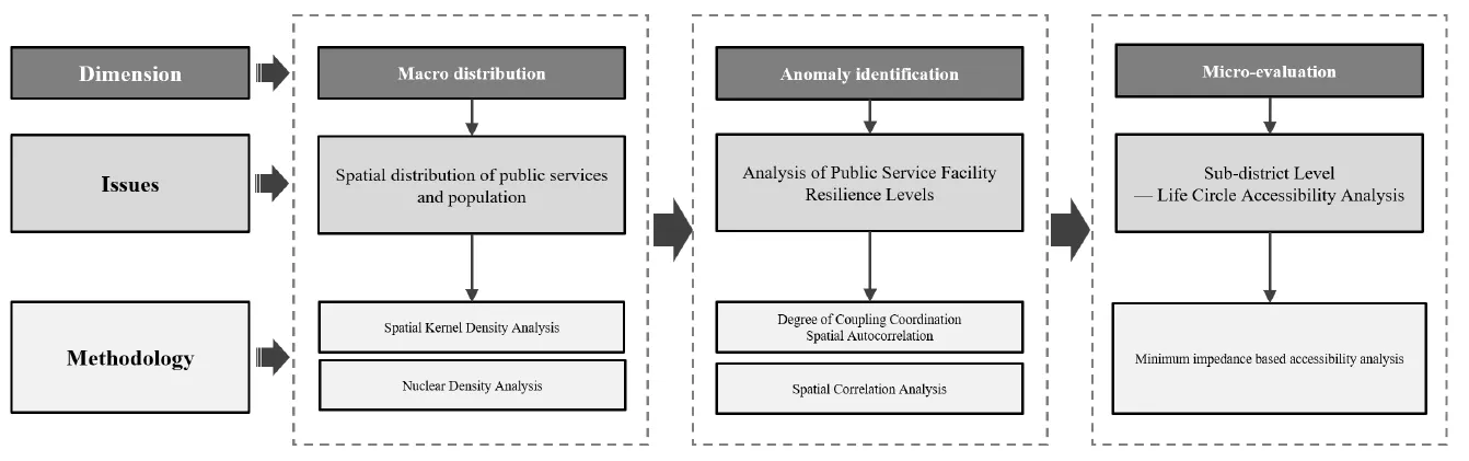 This paper takes Beijing as a research object to develop a framework for assessing urban public service facilities’ resilience, incorporating both macro and micro perspectives. Initially, the study utilizes spatial matching theory and coupling coordination models at the district and sub-district levels to analyze the spatial coupling between public service facility layouts and population distribution, thereby identifying regions exhibiting discrepancies in service supply and demand. Building on this foundation, the research further investigates at the neighborhood level the alignment between different types of public service facilities and residents’ daily activity patterns through the living circle theory and accessibility analysis models. From a macro perspective, research findings indicate that the layout of Beijing’s public service facilities exhibits a radial structure of centralized clustering and polycentric dispersion and that the resilience of these facilities diminishes from the city center outward. Microanalysis in three outlier sub-districts of Chaoyang District reveals that the accessibility to cultural and social welfare facilities in Daitou Sub-district is below the regional average and exceeds the typical 15-min walking distance accessible to the average person. Based on these findings, the paper proposes specific policy recommendations, including prioritizing the establishment of multifunctional public service facilities in densely populated and underserved peripheral areas and reserving adequate land for facilities in newly developing areas to ensure the sustainability of urban growth. Additionally, it is recommended that urban planners utilize dynamic data updating mechanisms to adjust the distribution of public service facilities, thereby better accommodating changes in population structure. This study not only highlights the dual role of public service facilities in enhancing urban resilience and living quality but also provides theoretical support and empirical evidence for creating a human-centered urban resilience spatial structure.