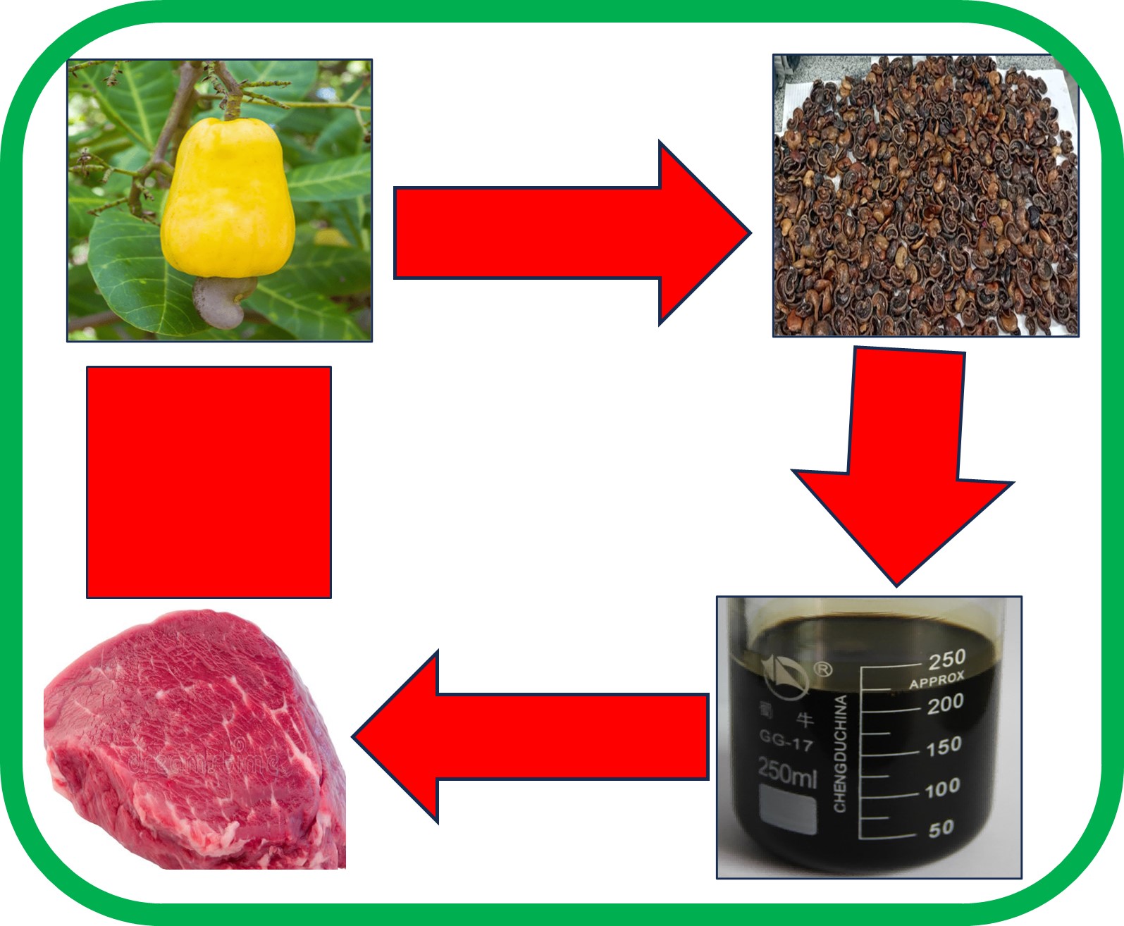 Food spoilage caused by microbial contamination has remained a major challenge in meat preservation, especially in regions with limited refrigeration infrastructure. The potential of cashew nut shell liquid (CNSL) as a natural antimicrobial preservative for beef, which is culturally significant and a highly consumed meat product worldwide, was investigated. The CNSL was extracted using ethanol and characterized by Gas Chromatography-Mass Spectrometry (GC-MS) and Fourier-Transform Infrared Spectroscopy (FTIR). Results revealed a high abundance of phenolic lipids, cresols, cardanol and resorcinol derivatives, with active O-H and C-O functional groups. The antimicrobial efficacy against Pseudomonas, Clostridium spp. and Proteus spp., which are major bacteria implicated in meat spoilage, was assayed by applying different concentrations (0.5%, 1.0% and 2.0%) of CNSL to the meat samples and evaluating microbial loads over a 14-day storage period. Results indicate a significant reduction in total viable counts and pathogenic bacteria, with optimal preservation observed at 2.0% CNSL. The study demonstrates that CNSL exhibits potential to act as an effective natural preservative and sets the foundation for its application in sustainable meat preservation strategies.utf-8