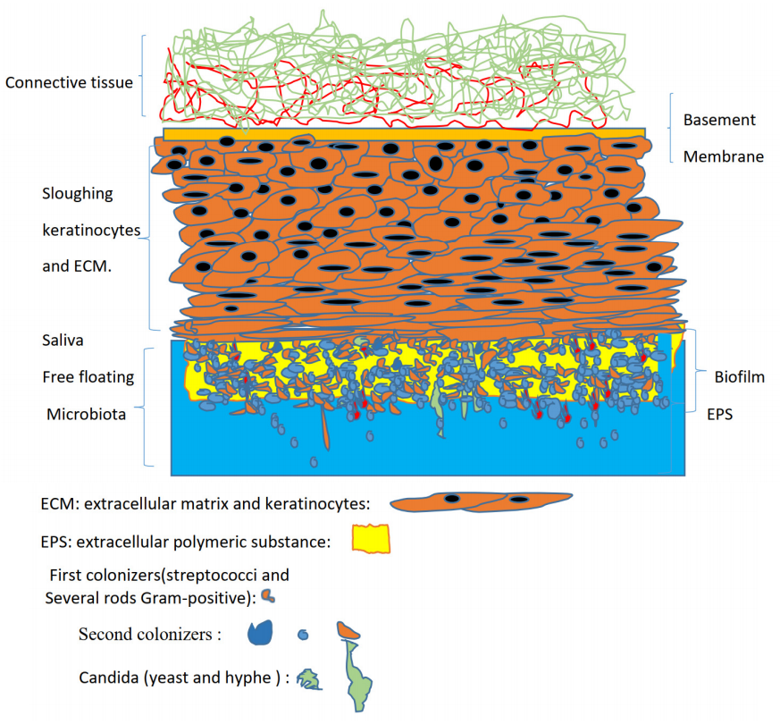Denture mycofilms (DMs) are complex, structured microbial communities that develop on removable dental prostheses and shape the oral microbiota of denture wearers. Up to three-quarters of individuals wearing removable dentures may develop denture stomatitis (DS), a highly prevalent inflammatory condition of the oral mucosa. Candida species are detected in approximately 70–80% of DS cases, supporting the concept of DS as a denture-associated oral candidiasis. The denture “mycofilm” is a polymicrobial network—dominated by bacterial and fungal taxa—embedded in an extracellular matrix. In the absence of effective denture hygiene, prostheses constitute a reservoir of microorganisms and may promote chronic or latent infection, particularly in vulnerable patients. Metagenomic studies of denture-associated biofilms in DS reveal a multi-kingdom community with strong bacterial–fungal interrelationships. Reported eukaryotic genera include Candida (including Nakaseomyces/Candida glabrata), Saccharomyces, and Malassezia, among others. Because DMs are located at the interface between an abiotic surface (the denture) and a biotic surface (the mucosa), they are exposed to repeated compressive and shear forces during mastication. Their viscoelastic properties, together with saliva-mediated viscosity, facilitate spreading, mechanical resilience, and persistence. Despite mechanical and chemical cleaning procedures, denture mycofilms may persist due to their architecture, composition, and adaptive mechanical behavior. These properties should be considered when designing preventive and therapeutic strategies for denture stomatitis, while accounting for patient-related systemic risk factors.utf-8