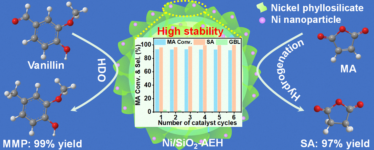 The aggregation and leaching of nanoparticles often reduce catalytic activity and hinder the long-term application of catalysts. Here, we synthesis a hollow Ni/SiO2-AEH catalyst with small Ni nanoparticles (NPs) encapsulated by nickel phyllosilicate (NiPS) via an ammonia evaporation-hydrothermal method. Compared with the Ni/SiO2-AE only synthesized via ammonia evaporation method, the Ni/SiO2-AEH catalyst after further hydrothermal treatment possesses more nickel phyllosilicate (NiPS) species, which enhances the stability of Ni NPs through the strong metal-support bonding (Si–O–Ni) in NiPS. By controlling the size of Ni NPs to 3.6 nm along with the presence of NiPS, we find that Ni/SiO2-AEH displays superior catalytic performance for maleic anhydride (MA) hydrogenation and vanillin hydrodeoxygenation, achieving yields of 97% for succinic anhydride (SA) and 99% for 2-methoxy-4-methylphenol (MMP), respectively. Importantly, the deactivation of Ni/SiO2-AEH is remarkably suppressed, with only a slight decrease in activity after five or six runs. The excellent catalytic activity and stability of phyllosilicate materials imply an extensive application in other industrial catalytic reactions.