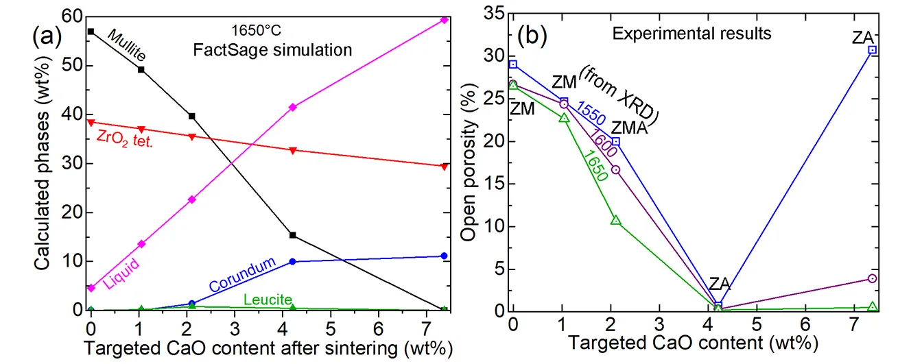 Fused zirconia-mullite (ZM) and zirconia-alumina (ZA) are expensive aggregates used in refractory formulations to enhance thermal shock tolerance and corrosion resistance, respectively. A cost-effective alternative approach was explored in this work to produce 37.4 wt% ZrO2 containing ZM utilizing conventional reaction sintering of siliceous clay, calcined alumina and monoclinic ZrO2. A series of chemical reactions ensued from 1200 °C, forming low quartz and cristobalite from the clay, in situ ZrSiO4, monoclinic ZrO2, α-Al2O3 and traces of leucite. 1600 °C was required to fully form mullite and monoclinic ZrO2 but it had 26.5% porosity even after firing at 1650 °C for 2 h. It consisted of small equiaxed primary mullite grains secondary mullite rods, and scattered and clustered, round ZrO2 grains. With 1.05% CaO addition, tetragonal ZrO2 formed, but 22.7% porosity remained despite the presence of 13.5% liquid phase having a low viscosity (0.6 Pa.s, from FactSage). With 2.11% CaO, porosity reduced to 10.7% but mullite partly dissolved, forming α-Al2O3 (ZMA aggregate). The added CaO mostly remained in the intergranular glassy phase rather than inside the ZrO2 grains but increased the thickness of the secondary mullite and the ZrO2 grains. Mullite was completely lost with 4.21% CaO doping but favorably formed cubic ZrO2 containing up to 0.26 at% Ca, interlinked α-Al2O3 rods and attained a low porosity of 0.2%. This ZA aggregate is limited to 1550 °C application temperature as excess liquid phase drained out beyond that. 7.37% CaO addition was detrimental as it formed an excessive anorthite-like liquid phase that percolated out at 1550 °C with 5.6% weight loss. Thus, in ZM-based calcium aluminate cement bonded refractory castables, the final CaO content should be restricted to below 2.1% to avoid partial dissolution of mullite.