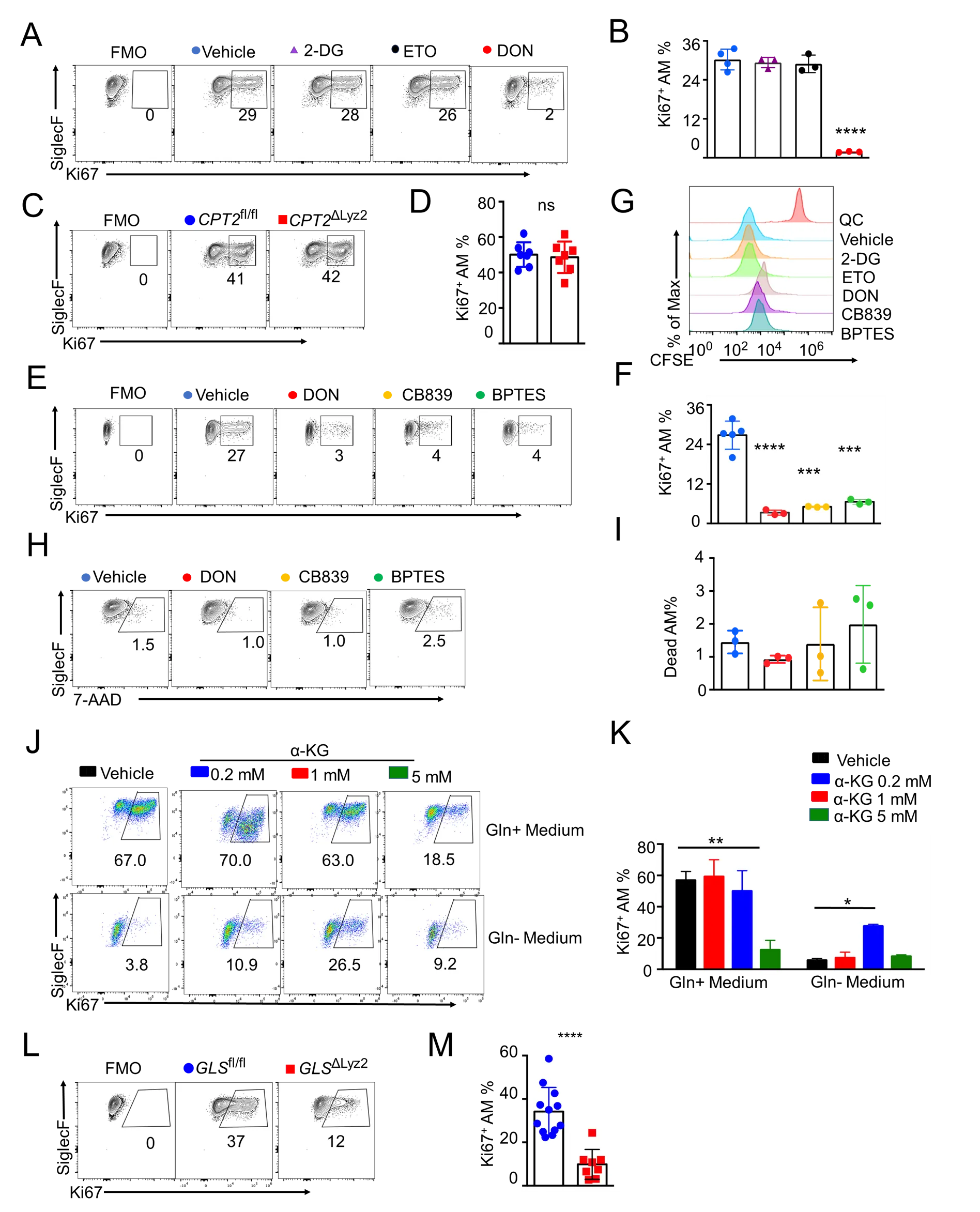 Alveolar macrophages (AMs) are critical for normal lung homeostasis, surfactant metabolism, and host defense against various respiratory pathogens. Despite being terminally differentiated cells, AMs are able to proliferate and self-renew to maintain their compartment without the input of the hematopoietic system in the adulthood during homeostasis. However, the molecular and metabolic mechanisms modulating AM proliferative responses are still incompletely understood. Here we have investigated the metabolic regulation of AM proliferation and self-renewal. Inhibition of glucose uptake or fatty acid oxidation did not significantly impact AM proliferation. Rather, inhibition of the glutamine uptake and/or glutaminase activity impaired AM mitochondrial respiration and cellular proliferation in vitro and in vivo in response to growth factor stimulation. Furthermore, mice with a genetic deletion of glutaminase in macrophages showed decreased proliferation. Our data indicate that glutamine is a critical substrate for fueling mitochondrial metabolism that is required for AM proliferation. Overall, our study is expected to shed light on the AM maintenance and repopulation by glutamine during homeostasis and following acute respiratory viral infection.utf-8