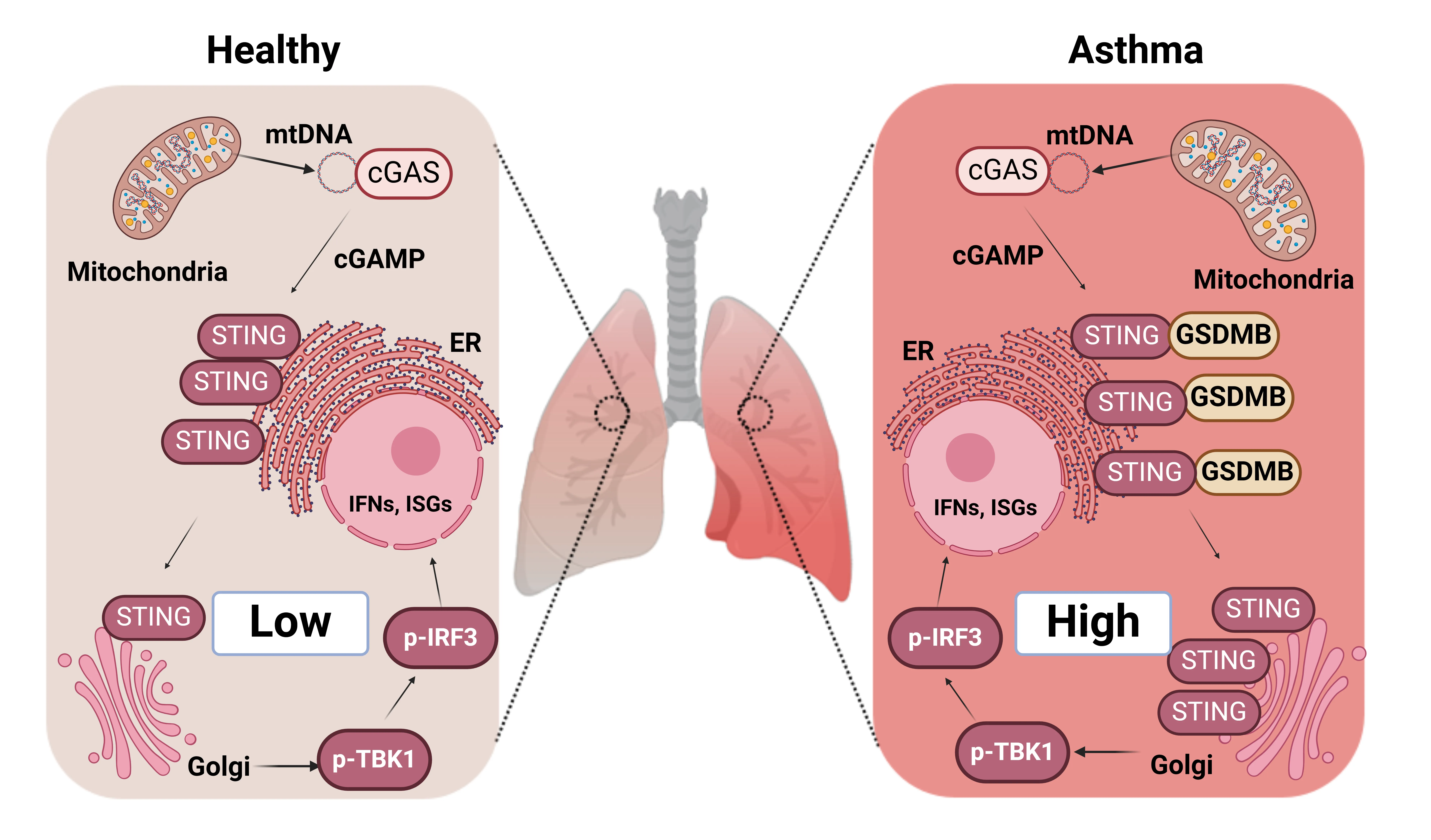 Released mitochondrial DNA (mtDNA) in cells activates cGAS-STING pathway, which induces expression of interferon-stimulated genes (ISGs) and thereby promotes inflammation, as frequently seen in asthmatic airways. However, whether the genetic determinant, Gasdermin B (GSDMB), the most replicated asthma risk gene, regulates this pathway remains unknown. We set out to determine whether and how GSDMB regulates mtDNA-activated cGAS-STING pathway and subsequent ISGs induction in human airway epithelial cells. Using qPCR, ELISA, native polyacrylamide gel electrophoresis, co-immunoprecipitation and immunofluorescence assays, we evaluated the regulation of GSDMB on cGAS-STING pathway in both BEAS-2B cells and primary normal human bronchial epithelial cells (nHBEs). mtDNA was extracted in plasma samples from human asthmatics and the correlation between mtDNA levels and eosinophil counts was analyzed. GSDMB is significantly associated with RANTES expression in asthmatic nasal epithelial brushing samples from the Genes-environments and Admixture in Latino Americans (GALA) II study. Over-expression of GSDMB promotes DNA-induced IFN and ISGs expression in bronchial epithelial BEAS-2B cells and nHBEs. Conversely, knockout of GSDMB led to weakened induction of interferon (IFNs) and ISGs in BEAS-2B cells. Mechanistically, GSDMB interacts with the C-terminus of STING, promoting the translocalization of STING to Golgi, leading to the phosphorylation of IRF3 and induction of IFNs and ISGs. mtDNA copy number in serum from asthmatics was significantly correlated with blood eosinophil counts especially in male subjects. GSDMB promotes the activation of mtDNA and poly (dA:dT)-induced activation of cGAS-STING pathway in airway epithelial cells, leading to enhanced induction of ISGs.utf-8