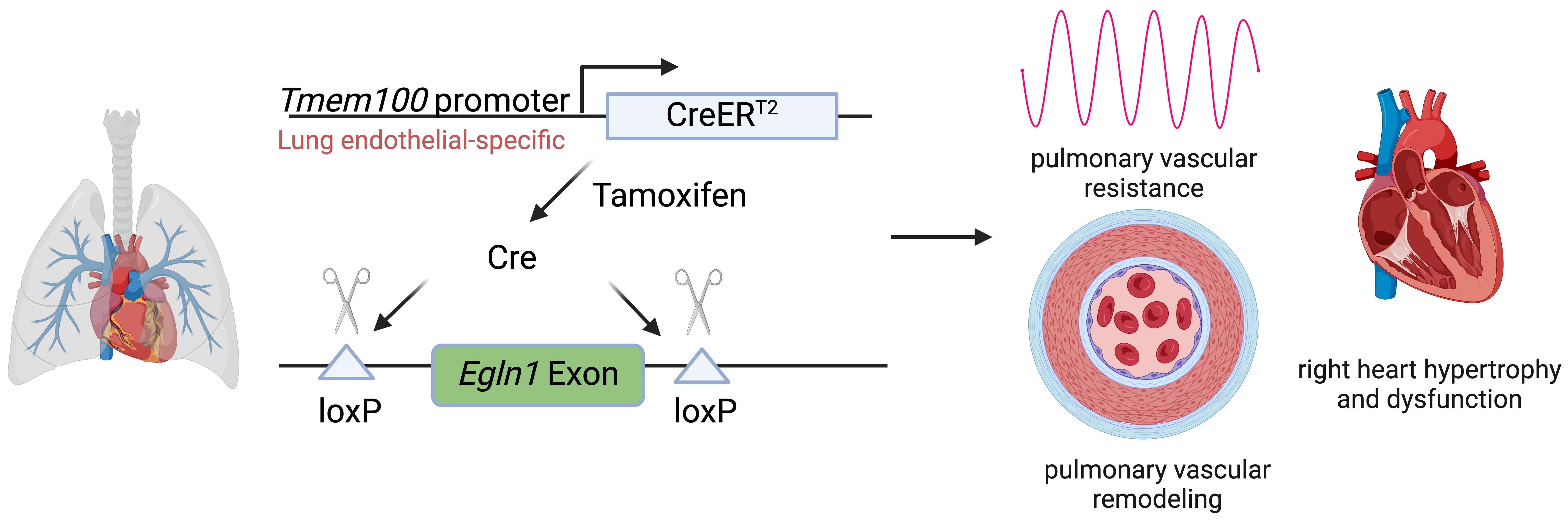 Pulmonary arterial hypertension (PAH) is a devastating disease characterized by high blood pressure in the pulmonary arteries, which can potentially lead to heart failure over time. Previously, our lab found that endothelia-specific knockout of Egln1, encoding prolyl 4-hydroxylase-2 (PHD2), induced spontaneous pulmonary hypertension (PH). Recently, we elucidated that Tmem100 is a lung-specific endothelial gene using Tmem100-CreERT2 mice. We hypothesize that lung endothelial-specific deletion of Egln1 could lead to the development of PH without affecting Egln1 gene expression in other organs. Tmem100-CreERT2 mice were crossed with Egln1flox/flox mice to generate Egln1f/f;Tmem100-CreERT2 (LiCKO) mice. Western blot and immunofluorescent staining were performed to verify the knockout efficacy of Egln1 in multiple organs of LiCKO mice. PH phenotypes, including hemodynamics, right heart size and function, pulmonary vascular remodeling, were evaluated by right heart catheterization and echocardiography measurements. Tamoxifen treatment induced Egln1 deletion in the lung endothelial cells (ECs) but not in other organs of adult LiCKO mice. LiCKO mice exhibited an increase in right ventricular systolic pressure (RVSP, ~35 mmHg) and right heart hypertrophy. Echocardiography measurements showed right heart hypertrophy, as well as cardiac and pulmonary arterial dysfunction. Pulmonary vascular remodeling, including increased pulmonary wall thickness and muscularization of distal pulmonary arterials, was enhanced in LiCKO mice compared to wild-type mice. Tmem100 promoter-mediated lung endothelial knockout of Egln1 in mice leads to development of spontaneous PH. LiCKO mice could serve as a novel mouse model for PH to study lung and other organ crosstalk.