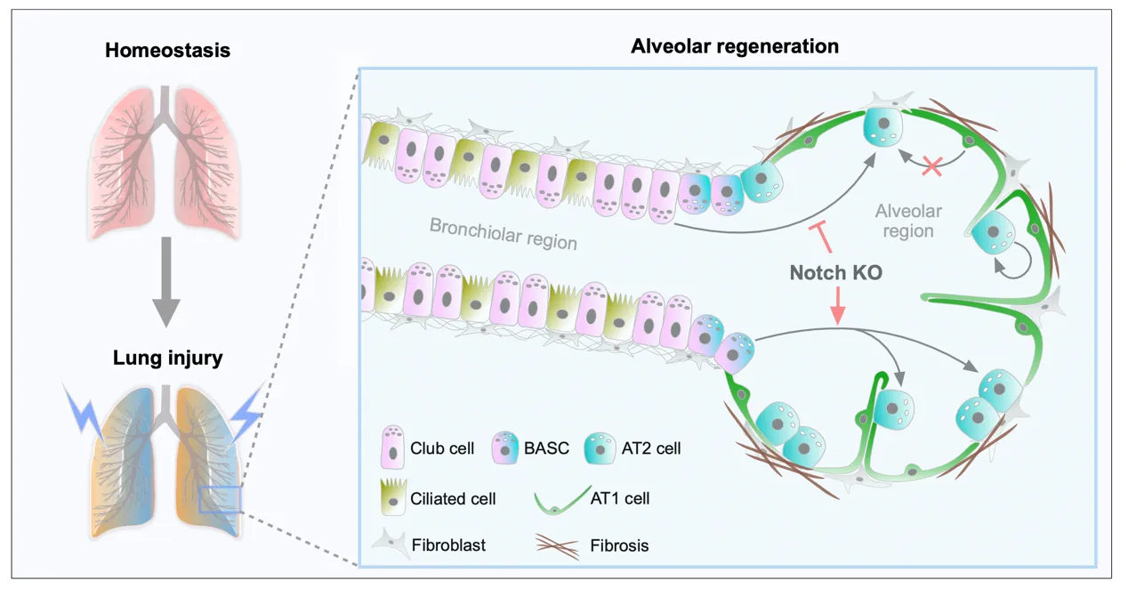 As alveolar epithelial stem cells, alveolar type II (AT2) cells play a pivotal role in sustaining alveolar homeostasis and facilitating repair processes. However, the sources of AT2 cell regeneration have remained contentious due to the non-specific labeling limitations of traditional single recombinase-based lineage tracing techniques. To address this issue, we employed dual recombination systems to develop more precise lineage tracing methodologies, effectively bypassing the shortcomings of conventional approaches and enabling specific labeling of lung epithelial cells. Our findings demonstrate that, following lung injury, regenerated AT2 cells do not originate from alveolar type I (AT1) cells, but instead derive from bronchiolar club cells and bronchioalveolar stem cells (BASCs), alongside the self-renewal of resident AT2 cells. Furthermore, we discovered that the transition of club cells and BASCs into AT2 cells is distinctly modulated by the Notch signaling pathway. This study not only provides novel insights into lung regeneration, but the innovative lineage tracing technology developed herein also holds promise as a technical support for research in diverse fields.