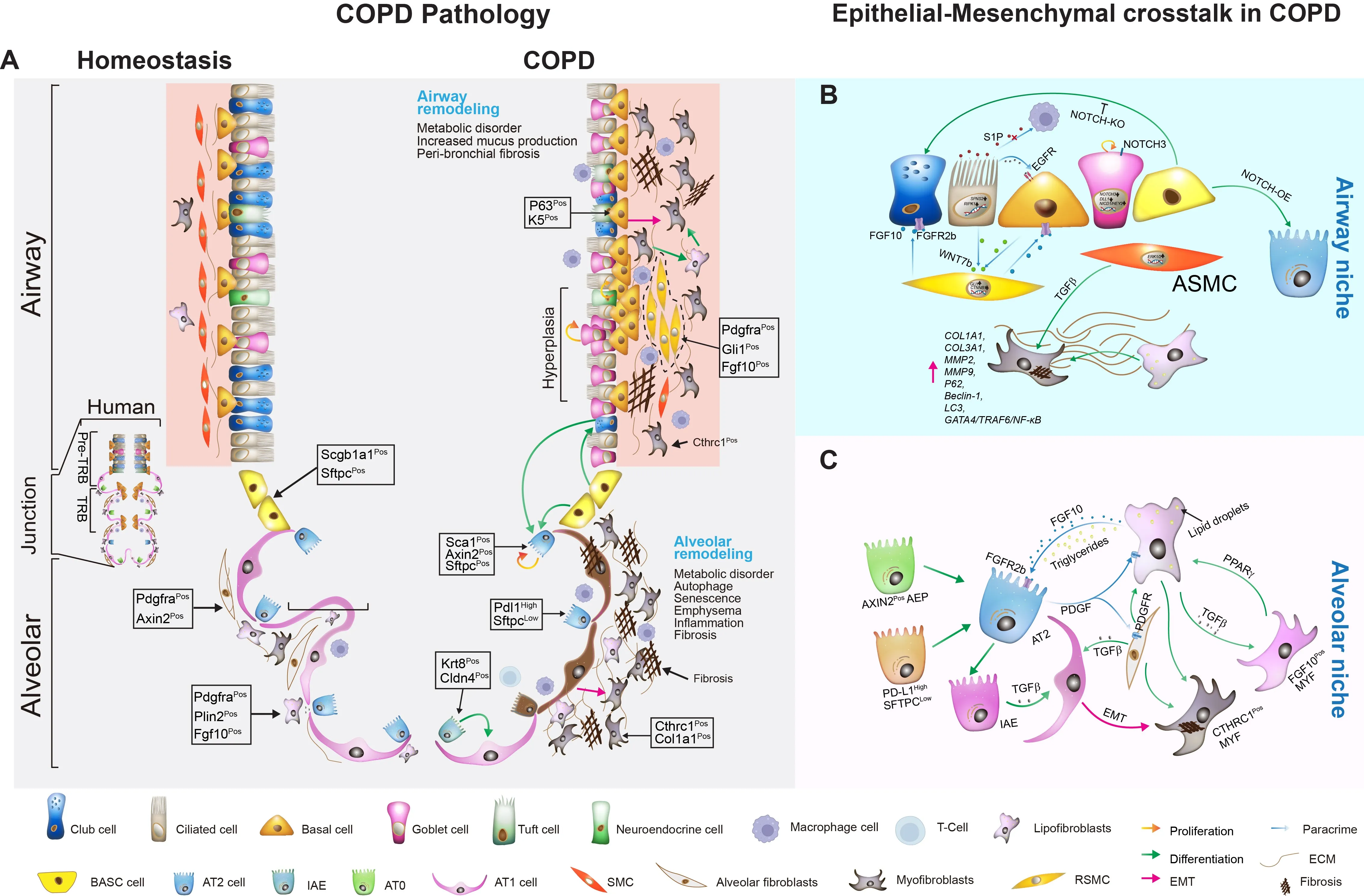 Chronic obstructive pulmonary disease (COPD) is a leading cause of global morbidity and mortality, characterized by progressive airway and alveolar remodeling. The disease pathogenesis is commonly driven by chronic environmental insults, leading to airway obstruction, emphysema, and chronic bronchitis. This review synthesizes emerging evidence that altered epithelial cell behavior and dysfunctional epithelial-mesenchymal interactions serve as pivotal drivers of COPD pathogenesis, orchestrating failed repair and structural degeneration. We detail how altered responses of airway (ciliated, club, basal, goblet) and alveolar (AT1 and AT2) epithelial cells lead to cellular senescence, metaplasia, defective regeneration, and barrier disruption, acting as primary instigators of pathogenesis. We also summarize current knowledge on the mechanisms of activation and pathogenic role of mesenchymal cells, which drive peribronchiolar fibrosis, alveolar destruction, and metabolic reprogramming, alongside the compromised reparative function of mesenchymal stem cells (MSCs). We emphasize how distinct mesenchymal niches (e.g., PDGFRαPos MANCs, FGF10Pos lipofibroblasts, SFRP1Pos fibroblasts) and distinct epithelial stem/progenitor subpopulations critically contribute to pathogenesis. Key signaling pathways—including FGF10/FGFR2b, WNT, Hippo, NOTCH, and TGF-β—mediate epithelial-mesenchymal transition (EMT), stem cell niche function, and structural remodeling. By dissecting how epithelial injury responses and mesenchymal niche failure collaboratively drive COPD progression, we identify actionable targets to disrupt pathogenesis and restore endogenous repair. We propose targeting EMT, including inhibiting EMT/fibrosis, promoting alveolar regeneration, MSC-based therapies, exosome-delivered biomolecules, and precision cell transplantation strategies, as promising future therapeutic strategies.