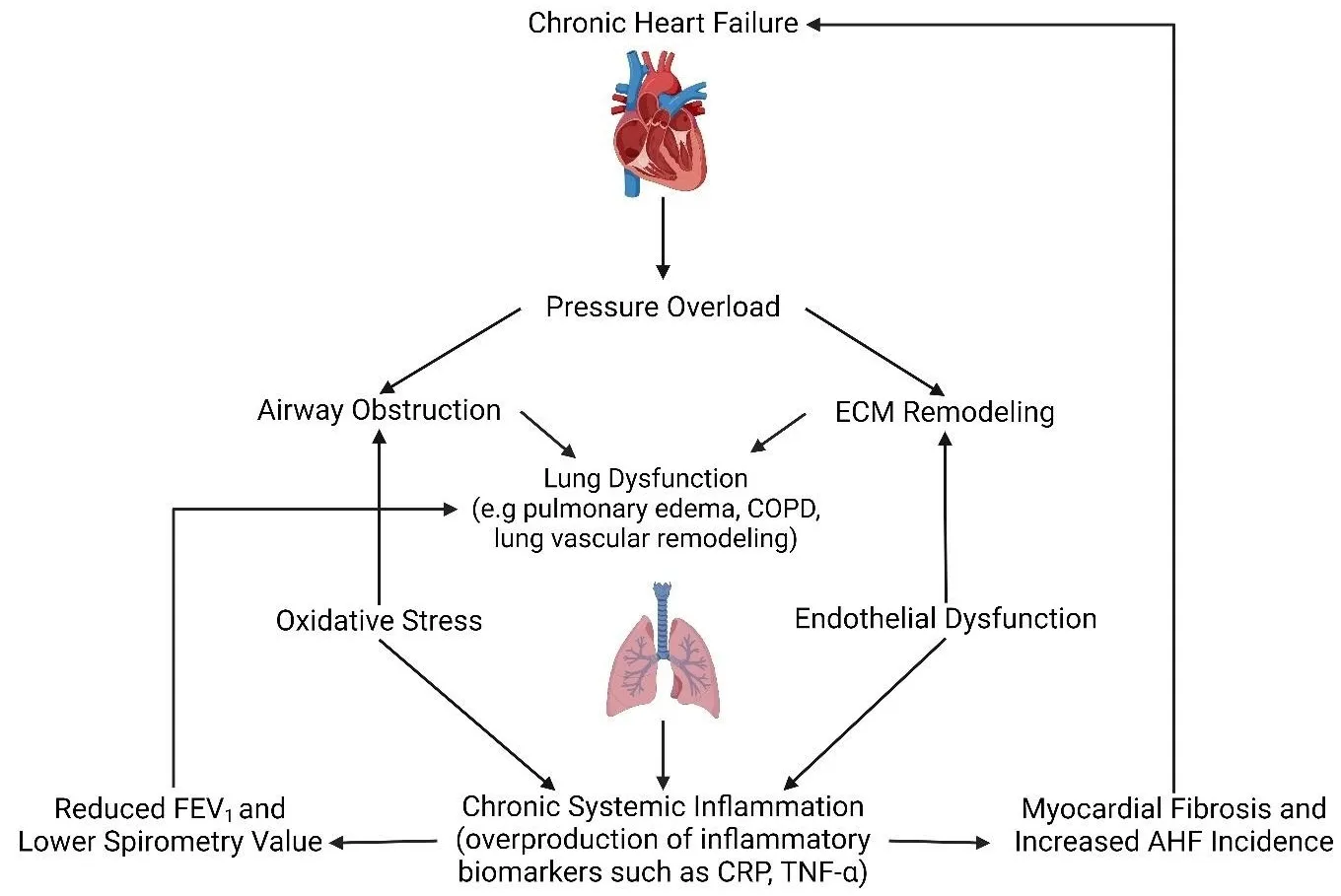 Heart failure (HF) is a common clinical syndrome marked by reduced cardiac output, elevated intracardiac pressures, and heart dysfunction. Chronic HF (CHF) is a syndrome characterized by a lack of blood flow and impaired pumping ability to the heart over time, while acute HF (AHF) arises suddenly due to incidents like myocardial infarction or cardiac arrest. HF has a significant impact on pulmonary health and function, leading to conditions such as pulmonary edema and restrictive lung patterns. Clinical evidence highlights the bidirectional relationship between HF and lung dysfunction. Declining lung function serves as a predictor for HF progression and severity, while HF contributes to worsening lung health. Animal models that induce HF through surgical methods further demonstrate the connection between heart and lung pathology. The main mechanisms linking HF and lung dysfunction are pressure overload and chronic systemic inflammation, with changes in the extracellular matrix (ECM) also playing a role. Additionally, environmental factors like air pollution exacerbate lung inflammation, increasing the risk of both HF and chronic obstructive pulmonary disease (COPD) incidence. Combined treatment approaches involving pharmaceutical drugs such as statins, Angiotensin-converting enzyme (ACE) inhibitors, and Angiotensin receptor blockers (ARBs) may benefit by reducing inflammation. This review will explore the complex interplay between HF and lung function, emphasizing their interconnected pathophysiology and potential integrated treatment strategies.
