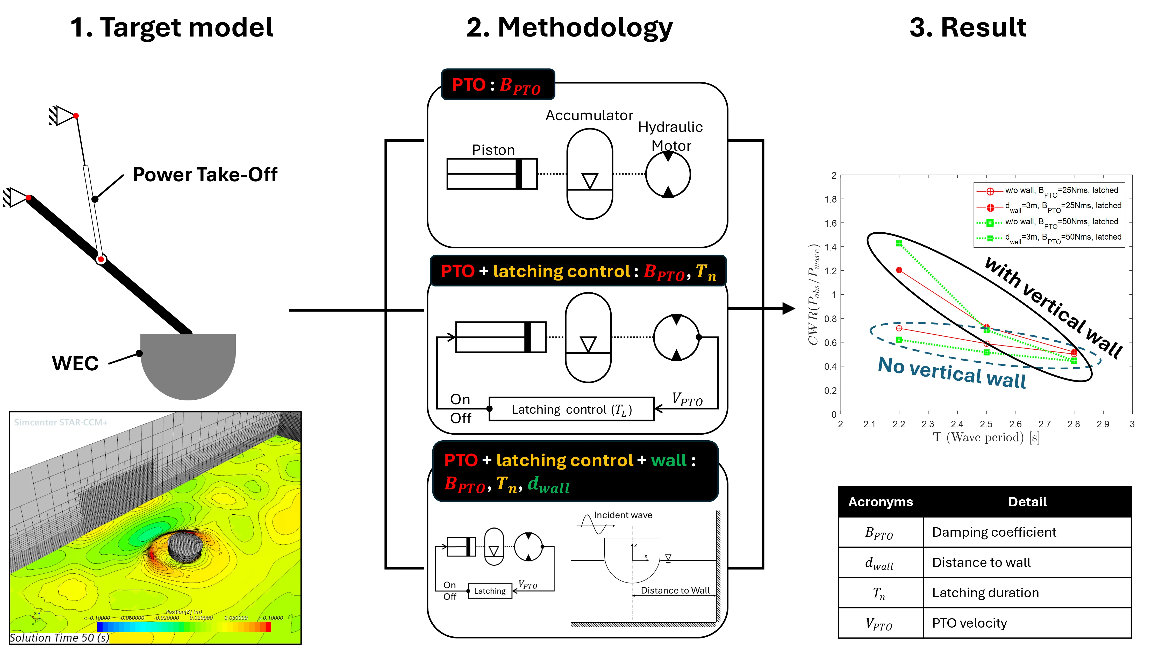 This study presents a numerical investigation of a point absorber wave energy converter (WEC) with a focus on improving its performance through the utilization of a vertical wall and latching control in the power take-off (PTO) system. Prior to numerical evaluations, experimental data incorporating PTO considerations and numerical simulation results were examined to validate the accuracy of the numerical methodology employed in this research. This study introduces a numerical PTO model and latching control for a further investigation. Comparative analyses were carried out on the displacement, velocity, and force of the PTO, absorbed power, and capture width ratio (CWR), considering the incorporation of a vertical wall and latching control. The results confirm that the introduction of both vertical wall and latching control significantly improves the CWR of the WEC, showing the effectiveness of incorporating a vertical wall and latching control in enhancing power extraction.