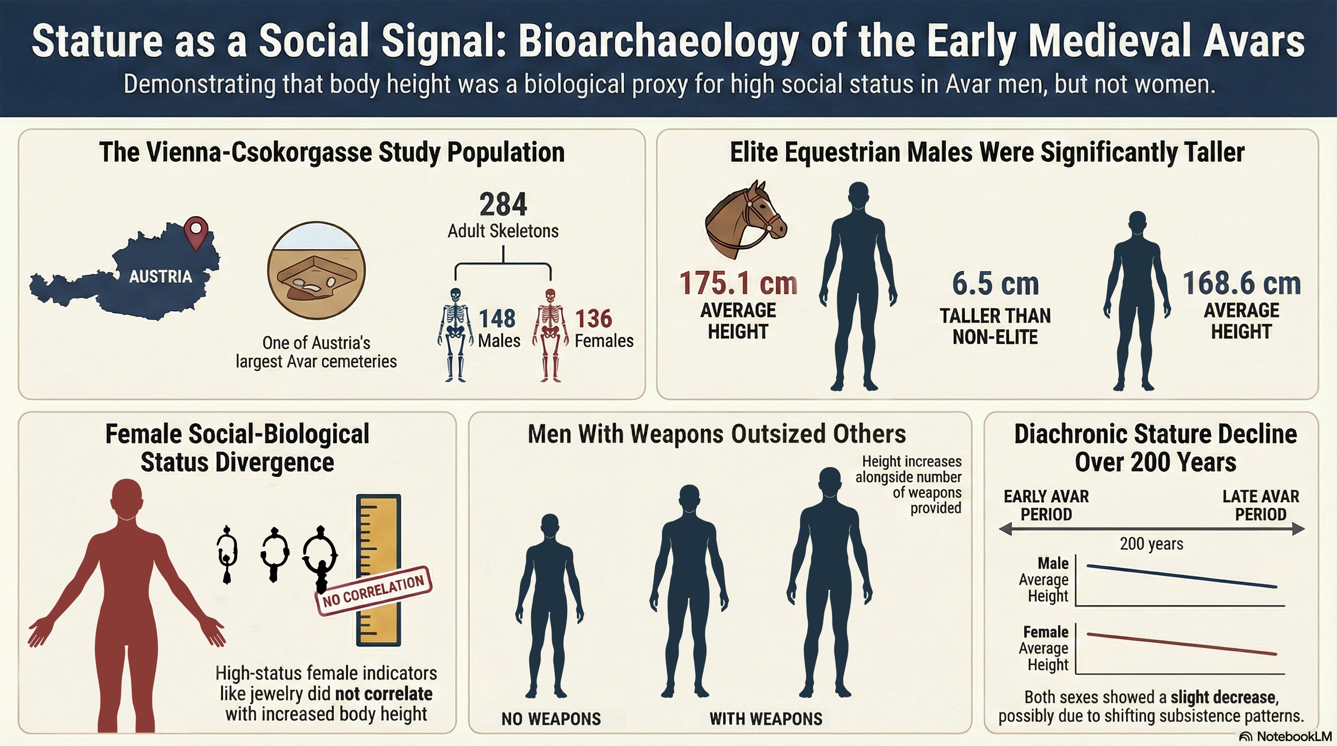 The relationship between material culture and body height, commonly used as a proxy for reconstructing economic conditions and social stratification, has not previously been examined for early medieval Avar populations. Therefore, this study investigates the association between estimated body height and grave goods, funerary characteristics, and activity-related indicators interpreted as markers of elevated social status in 148 male and 136 female individuals from the Avar burial ground Csokorgasse (Vienna, Austria). In addition, diachronic changes in body height from the late 6th to the late 8th century CE, a period marked by substantial transformations in subsistence strategies and lifestyle, are assessed. Overall, body height shows a slight but statistically insignificant decrease over time in both sexes. Among males, individuals interred in equestrian graves together with horses were on average more than 6 cm taller than males buried without horses. Similarly, males identified as warriors based on the presence of weapons as grave goods were significantly taller than those without weapons. Multipart belt sets, commonly interpreted as indicators of high-status males, display only a weak and statistically insignificant positive association with body height. In contrast, patterns observed among females differ markedly: Of the categories examined, only jewelry shows a statistically significant association with body height, with shorter women being buried with a greater quantity of jewelry. Thus, whereas male body height is positively associated with several markers of elevated social status, no comparable pattern can be identified for females. These results indicate a pronounced sex-specific divergence in the relationship between biological status, as reflected by body height, and socially expressed status in early medieval Avar society.