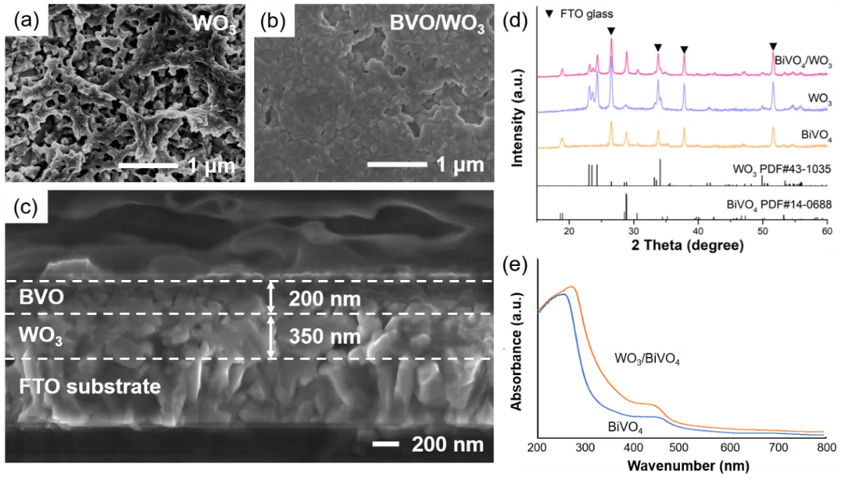 Photocatalytic synthesis of hydrogen peroxide (H2O2) can be an environmentally friendly and energy-saving solution. However, the oxygen reduction reaction (ORR) rate is limited due to the low solubility of O2 in water. In this study, a modified BiVO4 (BVO) photoanode combined with an Sn-coordinated phthalocyanine gas diffusion electrode (SnPc-GDE) was employed for the synthesis of H2O2, and the oxy-gen reduction reaction rate was increased through a unique three-phase interface system. When visible light was irradiated on the BVO photoanode, the hole-electron pairs were excited and the oxygen evolution reaction (OER) was driven through the holes, and the excited electrons were transferred to the SnPc-GDE to reduce O2 for the synthesis of H2O2. Oxygen vacancy enrichment on the BVO electrode was achieved by photoetching and annealing under an N2 atmosphere, which effectively improved the carrier separation efficiency. Complexation with a WO3 layer formed a built-in electric field, which further promoted the electron-hole pair separation. The SnPc catalyst-modified GDE electrode has the best selectivity for ORR and remains stable during long-term reactions. Under bias-free conditions, the generation rate of H2O2 reached 952.5 μM·L−1·h−1, with a Faradaic efficiency of 48.4%. This study provided a practical strategy for designing a highly efficient BVO/SnPc-GDE photoelectrochemical system to produce H2O2 based on improvement in electron-hole transmission efficiency and product selectivity.