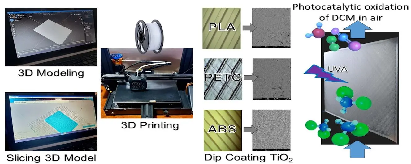 The study explored the use of 3D-printed plastics as catalyst supports for gas-phase photocatalytic applications. Specifically, it compared three commonly used plastic materials: PLA, ABS, and PETG. The process involved 3D modeling, additive manufacturing through 3D printing, and functionalization via dip-coating with titanium dioxide (TiO2). The study evaluated the loading capacity of the materials, the adhesion of the films, and the optical properties of the photocatalytic plates. Finally, the three plastic samples were tested as support materials in a laboratory-scale flat-plate reactor for the photocatalytic oxidation of dichloromethane in air. Loading capacities of around 3 mg/cm2 for TiO2 were achieved, along with radiation absorption capacities close to 65%. A correlation between loading and absorption fraction was identified, leading to the proposal of a simple saturation model; in turn, it allowed the predictive model of pollutant conversion as a function of the absorbed fraction of radiation. By analyzing both qualitative and quantitative properties and results, in order to determine the most suitable plastic material to be used in a photocatalytic wall reactor, PLA emerged as the best choice among the materials tested. These results show promise for the effective utilization of these plastics in the design of air decontamination devices.