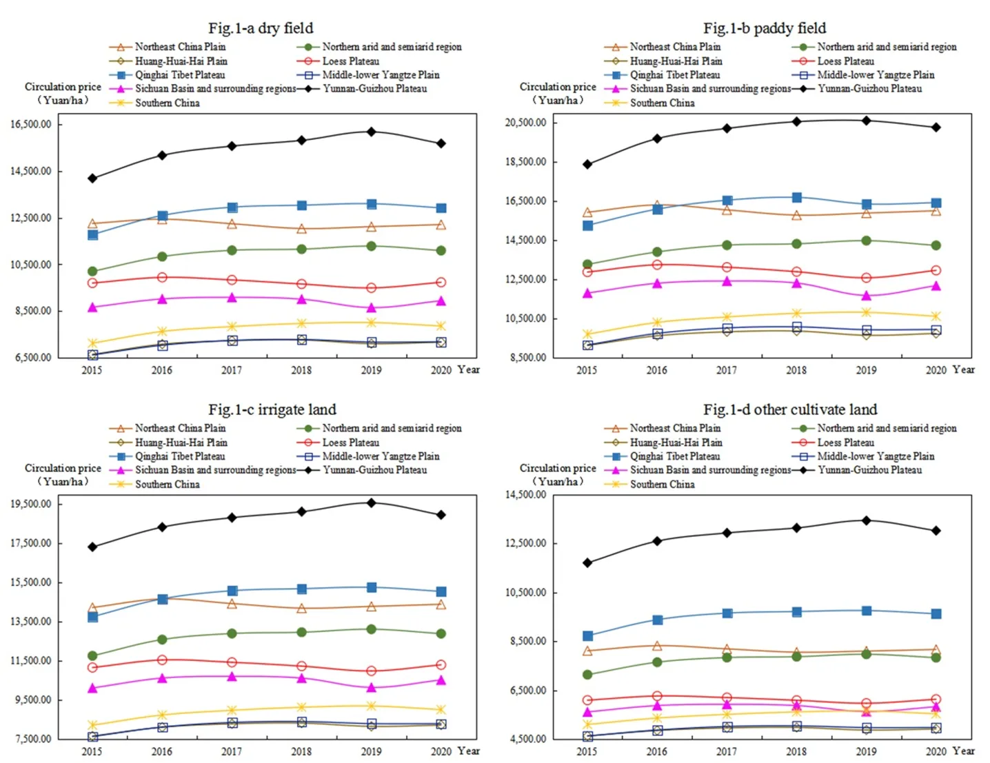 Farmland circulation is an important way to achieve moderate scale operation to ensure food security. Based on the spatial analysis and spatial econometric model, this paper studies the spatial-temporal evolution and influencing factors of cultivated land transfer price at the county level in China from 2015 to 2020. The results revealed the following: (1) the circulation price of farmland generally shows paddy field > irrigated land > dry land > other cultivated land. The farmland circulation price in Huang-Huai-Hai Plain is always the highest, whereas that in Qinghai–Tibet Plateau is always the lowest. (2) The spatial pattern of farmland circulation price is high in the south and low in the north, presenting an inverted U-shaped structure from east to west in 2015, and high in the east and low in the west, presenting an inverted U-shaped structure from north to south in 2020. Moreover, the spatial agglomeration was enhanced. (3) With the development of land market and urbanization, the restriction of natural factors of cultivated land on the farmland circulation price weakens, while the socio-economic attribute of cultivated land constantly strengthens. Based on the results, this paper puts forward some suggestions to prevent the overcapitalization of land.