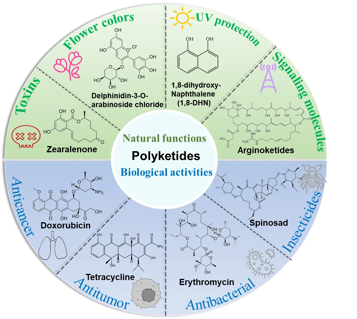 Polyketides (PKs) are a large class of secondary metabolites produced by microorganisms and plants, characterized by highly diverse structures and broad biological activities. They have wide market and application prospects in medicine, agriculture, and the food industry. The complex chemical structures and multiple steps of natural polyketides result in yield that cannot be met by purely synthetic methods. With the development of synthetic biology, a number of novel technologies and synthetic strategies have been developed for the efficient synthesis of polyketides. This paper first introduces polyketides from different sources and classifications, then the reconstruction of biosynthetic pathways is described using a “bottom-up” synthetic biology approach. Through methods such as enhancing precursors, relieving feedback inhibition, and dynamic regulation, the efficient production of polyketides is achieved. Finally, the challenges faced by polyketides research and future development directions are discussed.