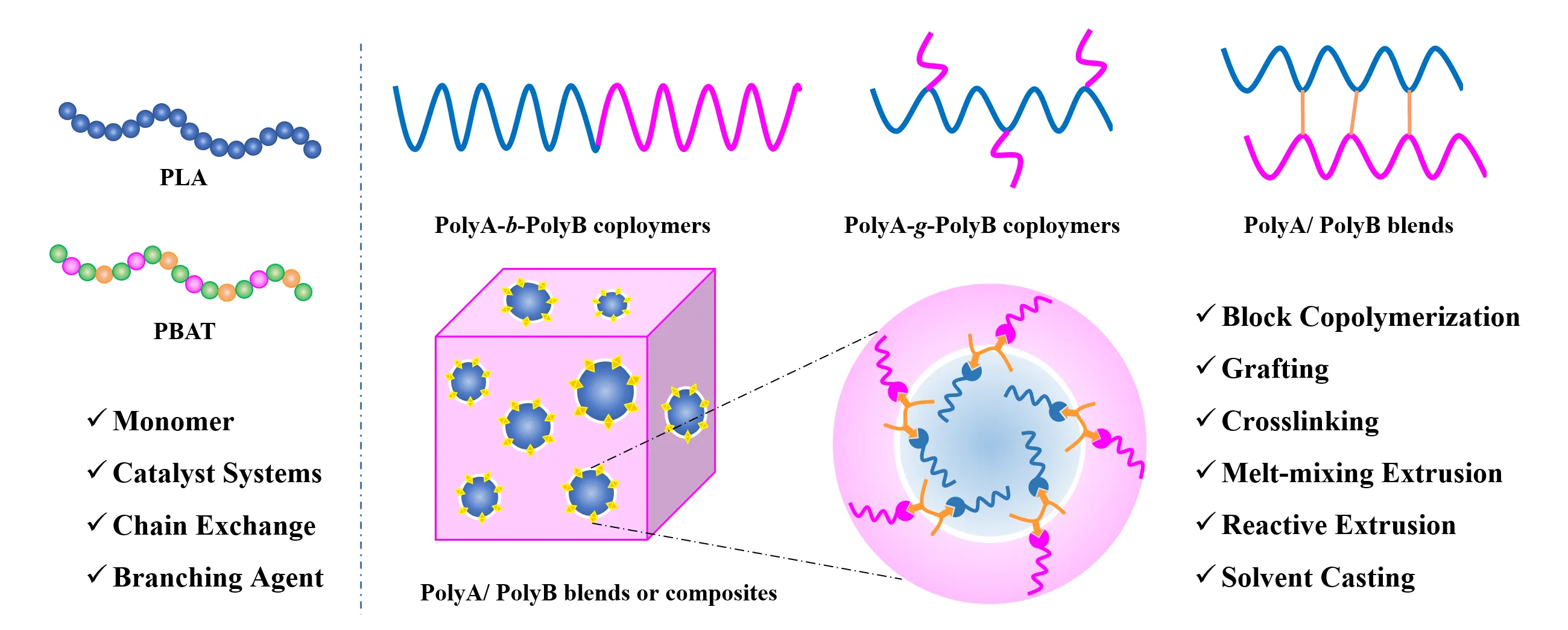 The acquisition of high-performance biodegradable plastics is of great significance in addressing the problem of environmental pollution of plastics. Polylactide (PLA) and poly(butylene adipate-co-terephthalate) (PBAT) are the most promising biodegradable polymers and have excellent functional properties. However, low elongation at break and impact strength of PLA and low tensile modulus and flexural strength of PBAT hinder their application. A large number of studies focus on improving the performance of PLA and PBAT and broadening their applications. In terms of polymer modification, this paper summarized recent progresses in both chemical and physical modification methods for PLA and PBAT, respectively. The properties of PLA can be improved by co-polymerization, grafting, cross-linking and blending. The properties of PBAT can be improved mainly through blending with other degradable polymers, natural macromolecules and inorganic materials. This review can provide the reference and ideas for the modification of biomass-based biodegradable plastics like PLA and fossil-based biodegradable plastics like PBAT.utf-8