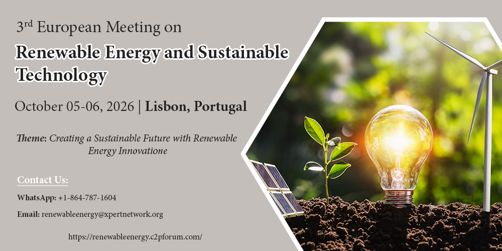 We are delighted to announce the 3rd European Meeting on Renewable Energy and Sustainable Technology, taking place from October 05-06, 2026, in Lisbon, Portugal.We eagerly look forward to welcoming participants from across the globe. Be a part of our insightful audience and branch your network with our cordially invited speakers and delegates holding renowned positions in their respective institutions and firms.