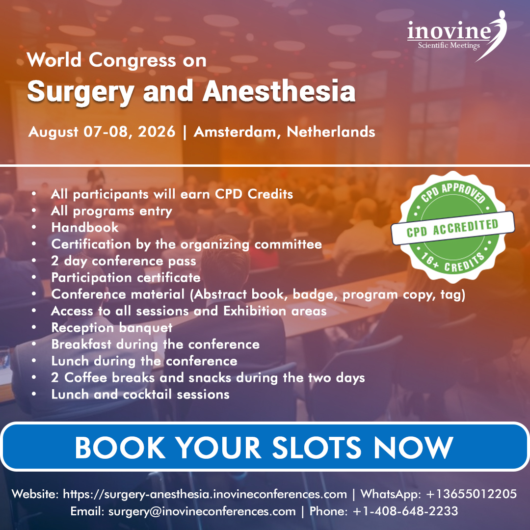 Title: World Congress on Surgery and Anesthesia 2026 Dates: August 07–08, 2026 Venue: Amsterdam, Netherlands